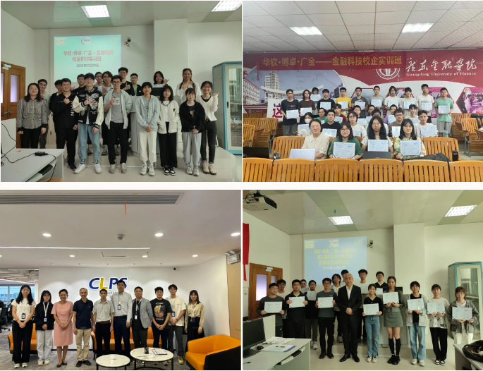 其中,与华钦科技集团公司开展的“华钦-广金金融科技人才培养班”通过实施“职业规划+实训+实习+就业”的一体化创新模式,深度推进产教融合。该模式不仅为学生提供了全面的职业规划服务,还通过云端培训平台进行了实战化的技术实训,并在金融百强企业IT研发中心安排了实习机会。2022至2023年间,多期培养班成效显著,数十名学生顺利通过了实训与实习,成功签约入职金融科技企业,实现了从校园到职场的无缝对接,有效提升了学生的就业质量与竞争力。
