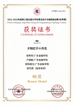 经过激烈角逐,由世界杯官网互联网金融与信息工程学院郭艺辉博士指导,2020级学生蔡永健、周溪赢、林建诚、张粤芳、卢瑞敏、欧阳振文组成的两支参赛队伍在此次竞赛中获得两项铜奖,展现了世界杯官网学子扎实的专业知识和技能。