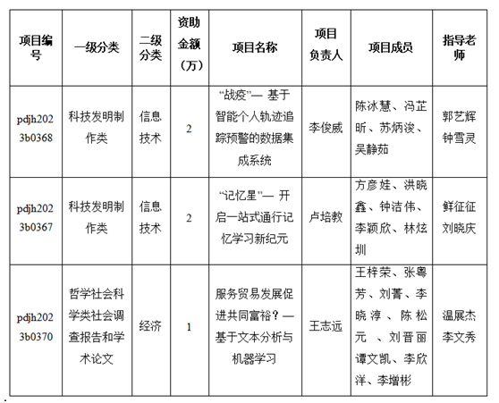 近日,团省委公布了2023年广东省科技创新战略专项资金(大学生“攀登计划”科技创新培育)资助立项项目名单。全校共9个,其中包括世界杯官网3个项目获得立项资助。世界杯官网3个项目分别为:李俊威团队《“战疫”—基于智能个人轨迹追踪预警的数据集成系统》、卢培教团队《“记忆星”—开启一站式通行记忆学习新纪元》、王志远团队《服务贸易发展促进共同富裕?—基于文本分析与机器学习》。3个项目共获专项资助资金5万元,各团队成员及立项详细信息见表1。