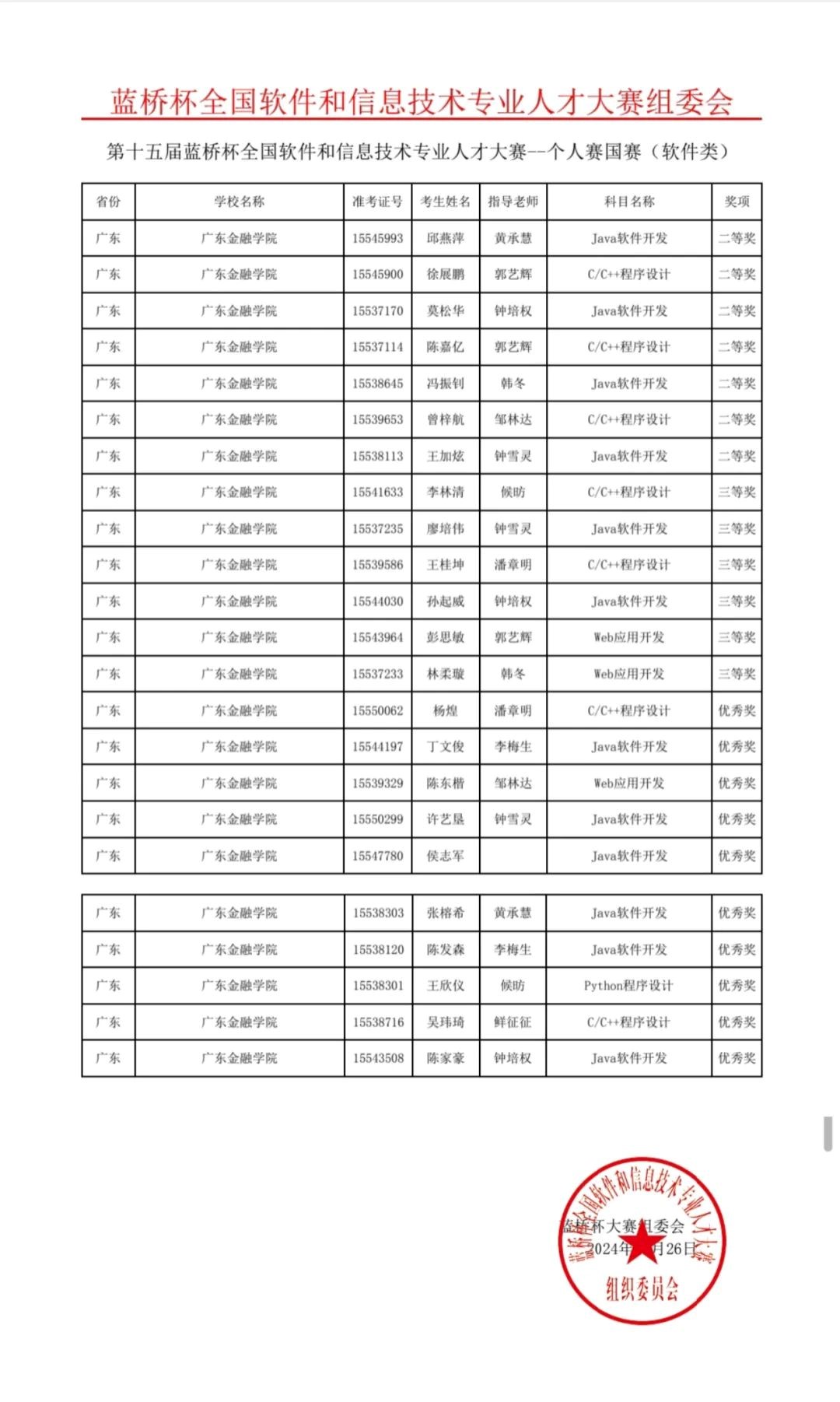 经过激烈角逐,徐展鹏、陈嘉亿、曾梓航3位同学获C/C++程序设计大学B组全国二等奖,邱燕萍、莫松华、冯振钊、王加炫4位同学获Java软件开发大学B组全国二等奖,李林清、王桂坤2位同学获C/C++程序设计大学B组全国三等奖,廖培伟、孙起威2位同学获Java软件开发大学B组全国三等奖,彭思敏、林柔璇2位同学获Web应用开发大学B组全国三等奖,杨煌、吴玮琦2位同学获C/C++程序设计大学B组全国优秀奖,丁文俊、许艺垦、侯志军、张榕希、陈发森、陈家豪6位同学获Java软件开发大学B组全国优秀奖,陈东楷同学获Web应用开发大学B组全国优秀奖,王欣仪同学获Python程序设计大学B组全国优秀奖。