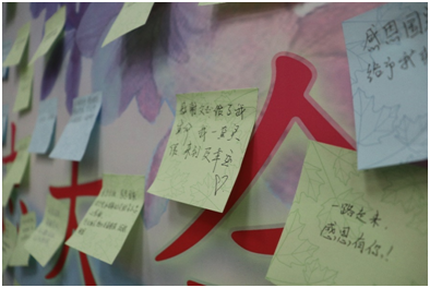 22级心理服务中心6名成员向大家表演《国家》手语操,表达他们对党和国家的感恩。同学们以便利贴为载体,在感恩板上写满了感激。