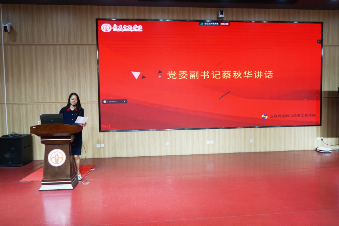 院党委副书记蔡秋华上台致辞,她对在任和即将上任的各学生组织干部表示祝贺,同时也对上一届学生干部为学院学生工作的发展和取得的成绩表示感谢。她表示,各学生组织干部是引学院风气之先的重要力量,希望即将上任的学生干部能够继承优良的工作作风,同时也对他们提出了新的期冀与要求: