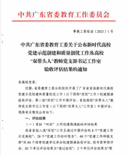 近日,从《中共广东省委教育工委关于公布新时代高校党建示范创建和质量创优工作及高校“双带头人”教师党支部书记工作室验收评估结果的通知》获悉,世界杯官网世界杯官网顺利通过首批“全省党建工作标杆院系”项目创建期满验收(全省26家之一)。