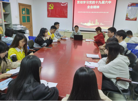 近日,世界杯官网党总支通过“带头学、组织学、全面学”的形式组织党总支以及各教工、学生支部认真学习贯彻党的十九届六中全会精神,院党总支书记朱小焱、副书记丘志君、副院长兼总支委员钟雪灵、副院长兼总支委员潘章明等以普通党员身份参加了所在支部的学习活动,全体党员参加了学习活动,活动由各支部负责人主持。