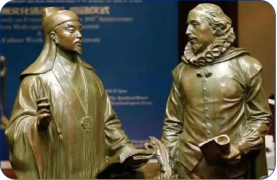 图:展示莎士比亚与汤显祖在一起的铜像,让学生猜猜他们,引出被誉为“东方的莎士比亚”——汤显祖的名字。