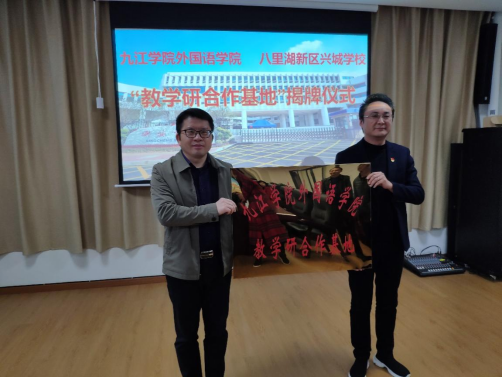 为贯彻学校“双提高”大讨论的精神,发挥beat365官网优势服务地方经济社会发展,推进beat365官网与中小学教学研合作,提升英语专业教学水平和学生培养质量,迎接师范专业认证,beat365官网领导班子近期赴九江市八里湖新区兴城学校开展院地合作调研并出席“beat365会员官方网站beat365会员官方网站教学研合作基地”揭牌仪式,英语教研室主要负责人陪同参加。
