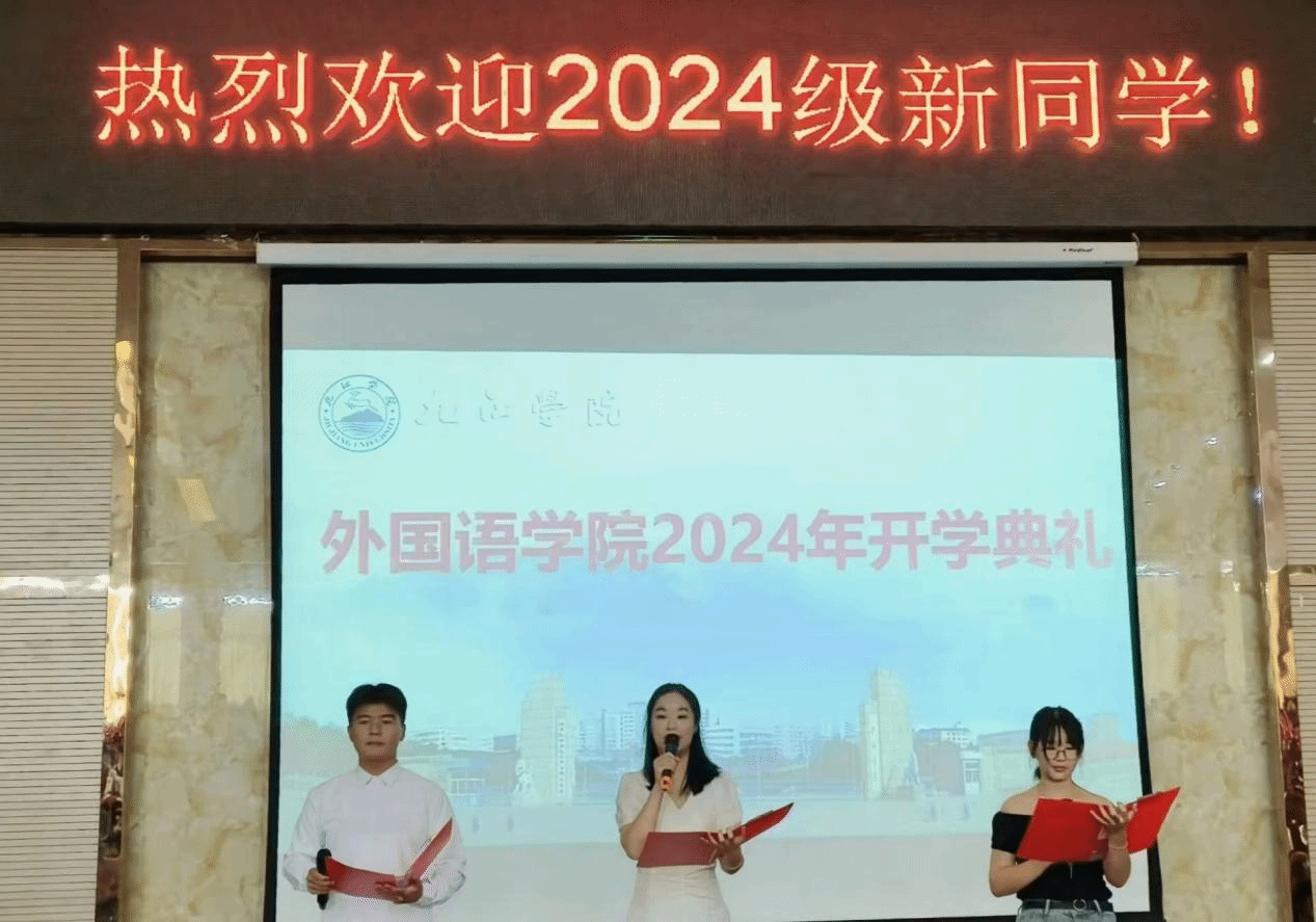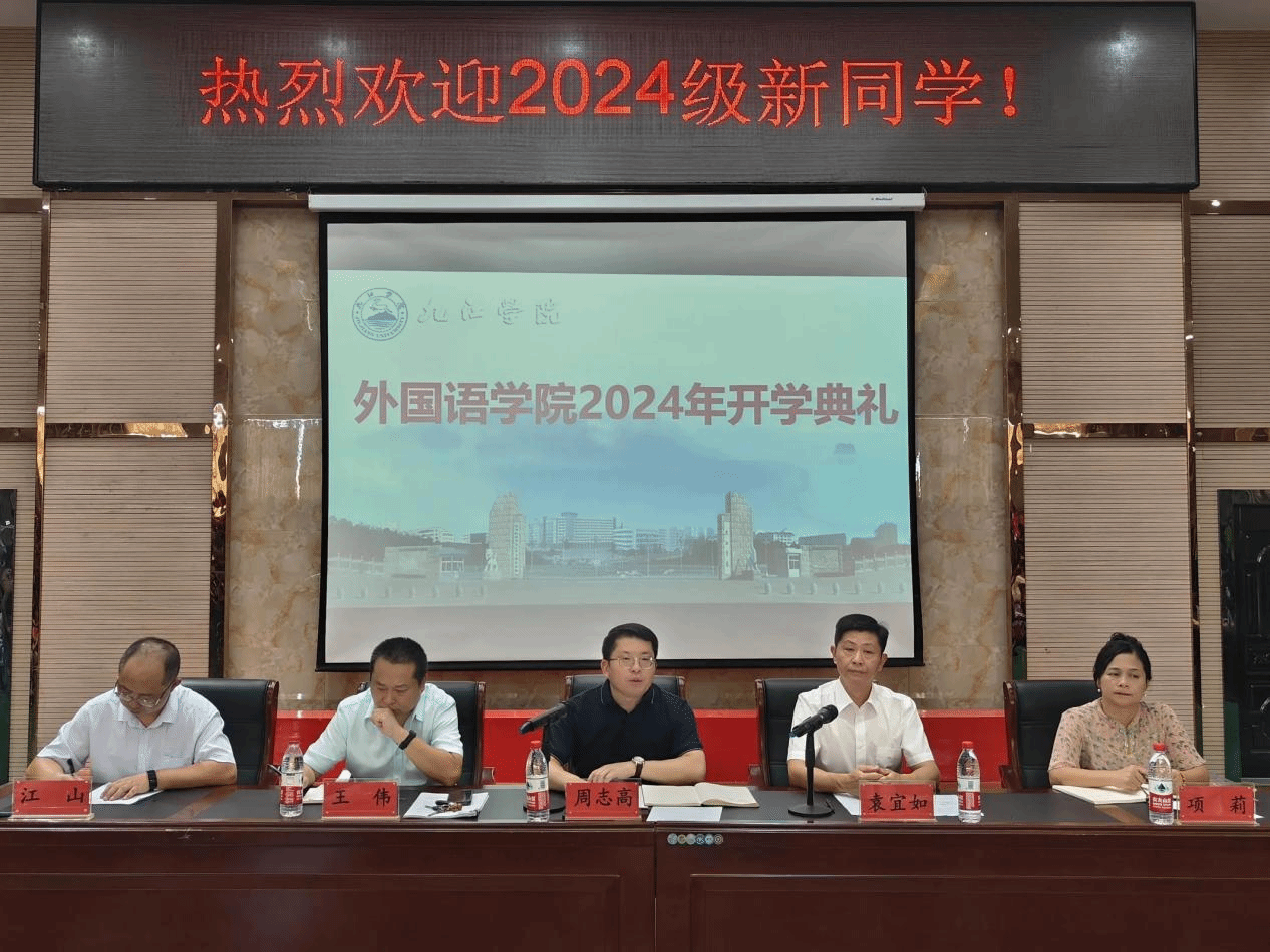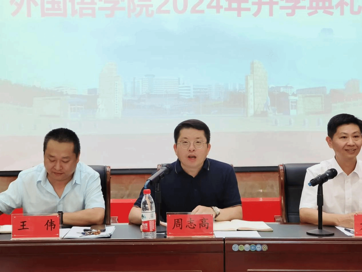 院长周志高代表全体教职员工热烈欢迎2024级新同学。他向大家详细介绍了学院的发展历史、师资力量和学院近年来取得的成绩。他鼓励新同学们在接下来的学习中,刻苦钻研本领,提升专业技能,通过语言去了解世界,努力成为文化交流的使者,努力做到“外显精气神,语藏锦绣文”。学院的教师队伍能够为同学们的成长提供坚实的保障。近年来,外院师生在省级以上比赛中荣获 160 多项奖项,英语专业在 2021 年获得四星级专业评价,在2023年通过教育部师范认证。