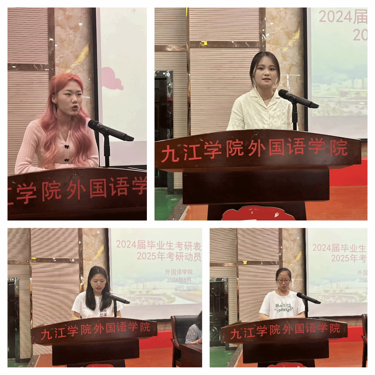 考研标兵代表张玉婷、胡容、范院婷、张佳祺、陈莹交流发言。她们分别被对外经济贸易大学、江西师范大学、湘潭大学、四川外国语大学等高校录取。她们细心地传授考研经验,分享考研技巧,为有考研意向的同学提供了极大帮助。