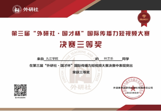 近日,由外研社主办的第三届“外研社·国才杯”国际传播力短视频大赛圆满落幕并公布了获奖名单,由beat365官网日语专业师生组成的团队积极参加比赛,最终以作品“中国人物—朱熹”喜获全国三等奖。团队成员分别是杨文蕾、赵蓝图、刘艺、黄欣悦、叶芷乐五位学生。日语小语种教研室主任陈德超博士、专任教师孙旭博士获得本次比赛指导教师三等奖。