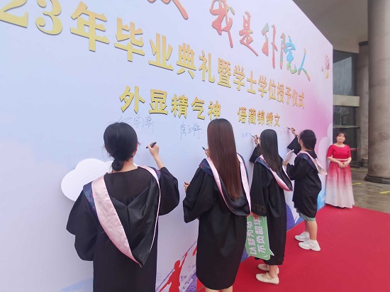 毕业典礼作为最后一节公开课,也是一堂深刻的思政大课。2023年毕业典礼仪式感强,幸福感爆棚:来参加毕业典礼的同学走上红毯,穿过“我们毕业了”的时光之门,来到“我骄傲,我是外院人”的大型签名墙签名、拍照留念,进入香远楼三楼报告厅的主会场,同学们已经谈着吉他唱起毕业歌,印有“beat365会员官方网站beat365会员官方网站青春不散场”的定制款可乐摆放在座位上,到场的同学都收到了有院长、书记寄语的定制款明信片,明信片上剪纸版beat365会员官方网站校园十大景色……