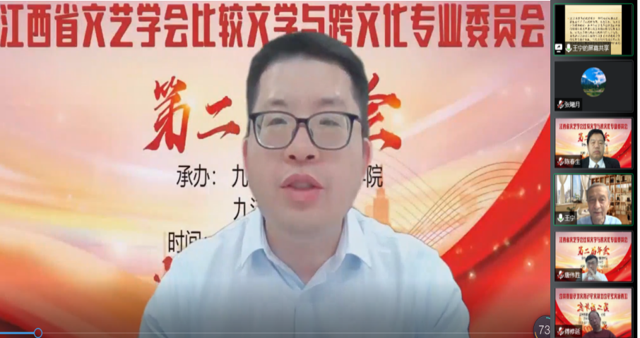 11月12日,江西省文艺学会比较文学与跨文化专业委员会第二届年会在beat365官网顺利召开。本次年会由江西省文艺学会比较文学与跨文化研究专业委员会主办,beat365官网beat365会员官方网站、文学院承办。受疫情影响,本次年会采用线上线下结合、线上为主的方式举行。中国社会科学院陈众议教授、上海交通大学王宁教授、江西师范大学傅修延教授、副校长陈春生教授以及来自全国20余所高校和科研机构的200多名专家、学者和研究生云端连线,齐聚一堂。
