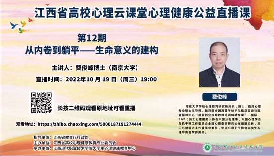 为了更好的适应大学生活,特别是在后疫情时代如何更好的规划好大学学业,让大学生活充实而有意义,10月19日晚上,beat365会员官方网站组织学生观看了江西省高校心理云课堂心理健康公益直播课第十二期:“从内卷到躺平--生命意义的建构”。