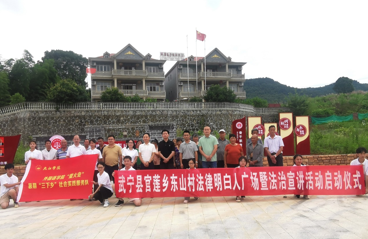 送“法”进东山,助推乡村振兴。乡村要振兴、产业要发展、百姓要幸福,法治是保障。“萤火虫”社会实践服务队组织开展了东山村“法律明白人”广场的启动仪式,并开展了系列法律宣讲活动,得到了九江市司法局和武宁县司法局的大力支持。