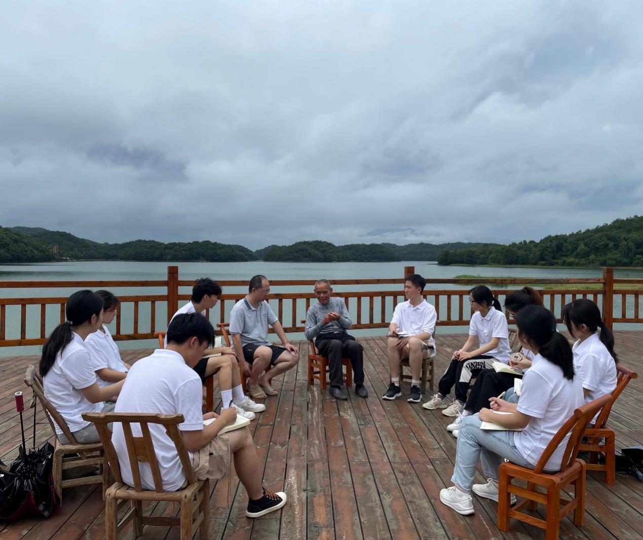 要想富,先修路。老支书彭仁训爷爷和同学们围坐在庐山西海之畔,讲述了上世纪80年代以来东山村的历史变迁,以及贯穿东山村整个发展史的交通变化。交流中,他详细地讲述了东山村是如何从一个“三面环水,一面靠山”的孤岛,发展成现在交通便利、产业兴旺的先进村、示范村。言语中无不流露着一个老村干部的自豪。