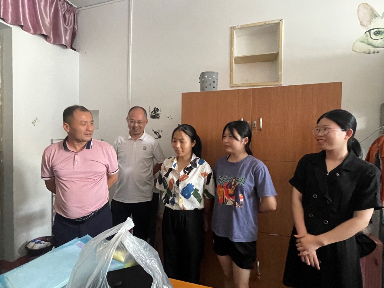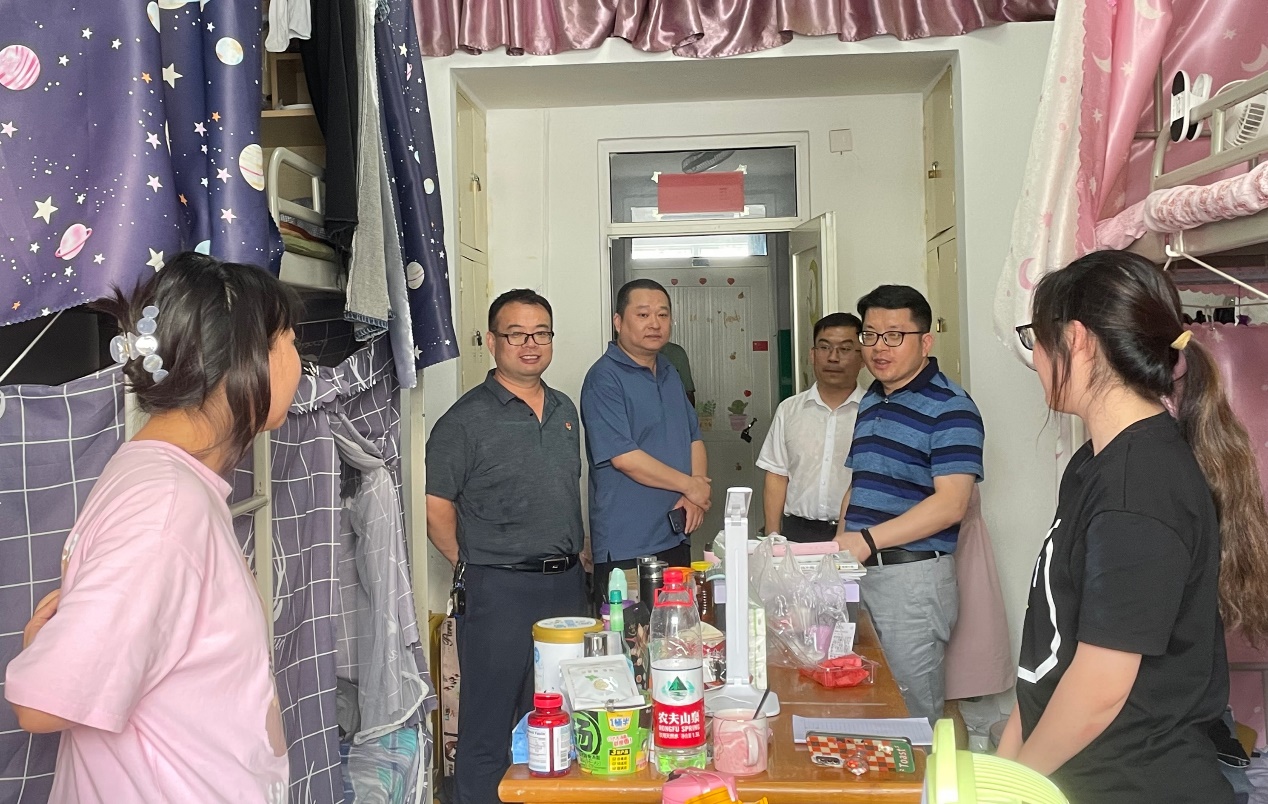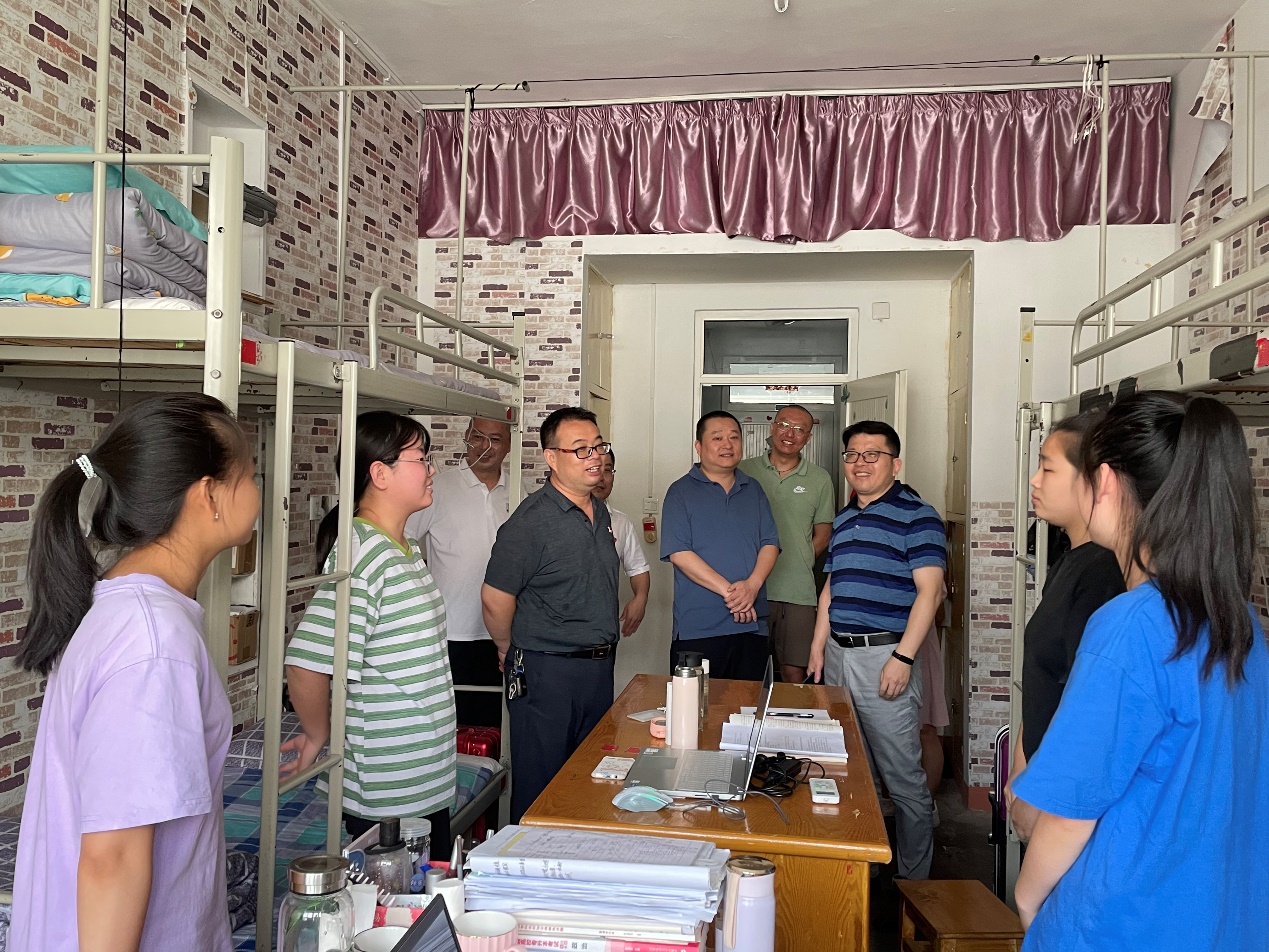 盛夏时节,万物并秀,beat365会员官方网站2022届学子迎来了毕业起航的重要时刻。拳拳关怀心,殷殷师生情, 6月27日下午,院长周志高,党委书记闫来英,党委副书记彭晓,副院长王伟、项莉,思政科、学生科相关辅导员一同走访宿舍慰问毕业生。学院领导就专升本考试准备情况、毕业前夕饮食住宿、本科生离校准备以及毕业去向等进行详细了解,对即将奔赴就业岗位的毕业生寄语美好祝福。