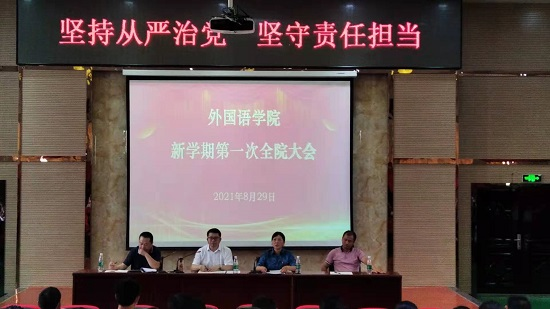 会上,院长周志高传达了新学期学校领导干部会议精神,并对beat365官网暑期工作进行了总结。周志高指出,今年是“十四五”规划开局之年,在学校党委和行政的正确指导下,beat365官网各项工作运行良好,顺利完成了第二轮岗位竞聘工作,“双提高”大讨论、专业综合评价稳步推进,疫情防控、毕业生就业择业扎实有效。周志高对新学期工作进行了全面部署,希望全体教职工围绕学院中心工作,全力以赴推进专业综合评价,加强省级、国家级一流专业建设。他强调,外语作为一门学科,肩负着文化文明的传承,我们要发挥学院、学科优势,寻求服务地方高质量发展的契合点,着力于提高beat365官网教育教学水平和人才培养质量。