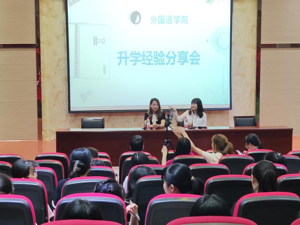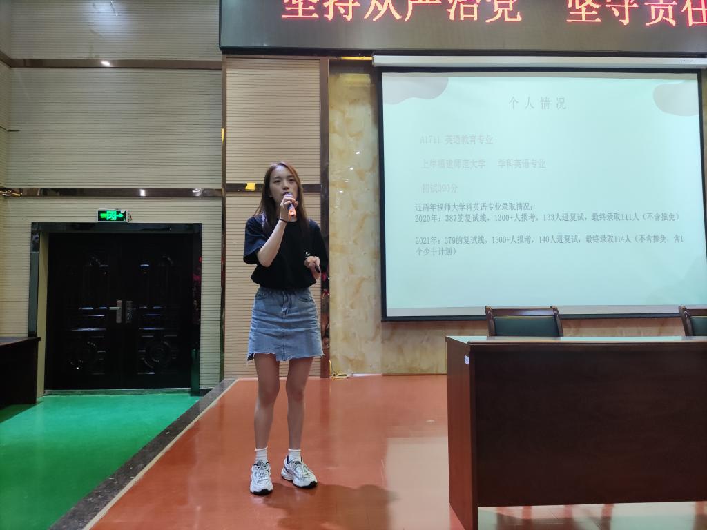 本学院两位名校年轻教师周燕平和郭思霈分别对英语笔译和出国留学进行分享交流。两位老师着重强调了英语备考过程和复习方法,同时详细说明了留学申请的途径及必备条件,这些宝贵的学习经验都有利于同学们的规划和发展。最后周志高院长上台发言,鼓励同学们积极考研,努力认真的追逐梦想,并代表学院各位老师,寄托了对考研同学的期待与信心。