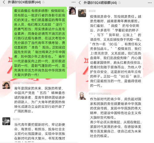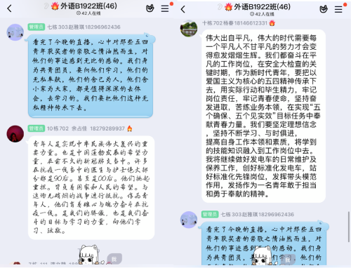 同学们兴致高昂,准时收看直播。“江西青年五四奖章”获得者南昌疾病预防控制所消杀科科长杨波、南昌大学“稻渔工程”团队代表简少卿等、江西省青年志愿者协会会长胡剑峰、武宁县消防救援大队副政治教导员李俊、南昌大学第二附属医院抗疫援鄂国家医疗队联络员兼专家组成员和门诊部副主任何显炬参加了本次分享会。他们分别对自己的事迹进行了简单的分享,随后接受了访谈并与观众进行了互动。通过他们的事迹,团员青年们真正理解了什么是五四精神、什么是青春担当。他们都是来自各行各业的平凡人,但他们却做了不平凡的事。“没有从天而降的英雄,只有挺身而出的凡人。”正是这一个个平凡的人,生动展现了五四精神,诠释了青春担当。