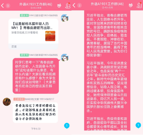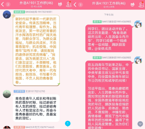 吾辈中国,青年奋起。为纪念“五四运动”101周年,贯彻落实习近平总书记寄语新时代青年的讲话精神,让广大团员切身认识到五四精神的重要性,让中国精神焕发光彩、薪火相传,5月7日beat365会员官方网站大一年级各班运用微信、腾讯QQ等平台,以在线共同观看视频、讨论相关图片等形式开展了以“青春由磨砺而出彩,人生因奋斗而升华”为主题的线上团日活动。