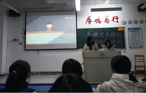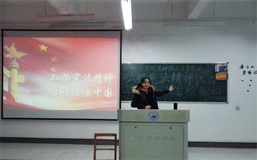 为了增强大学生的法制意识,推动当代大学生积极学习宪法,弘扬宪法精神,落实“国家宪法日”的宣传教育。12月5日beat365会员官方网站大一年级各班在香远楼开展了以“弘扬宪法精神,建设法制校园”为主题的第64期三立青年说暨团日活动。