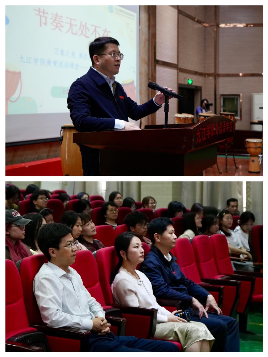 2025年4月16日下午,beat365会员官方网站艺术教育中心推出的“万象之美·美在身边”美育流动课堂活动在beat365会员官方网站三楼报告厅举行。本次讲座以《节奏无处不在》为主题,特邀艺术学院打击乐教师、艺术教育中心美育教师纪宇媛博士担任主讲,beat365会员官方网站院长周志高主持。beat365会员官方网站党委委员、副校长查振华,beat365会员官方网站党委书记袁宜如,艺术教育中心主任兼艺术学院副院长张栗娜出席活动,与数百名师生共同参与这场别开生面的美育实践。