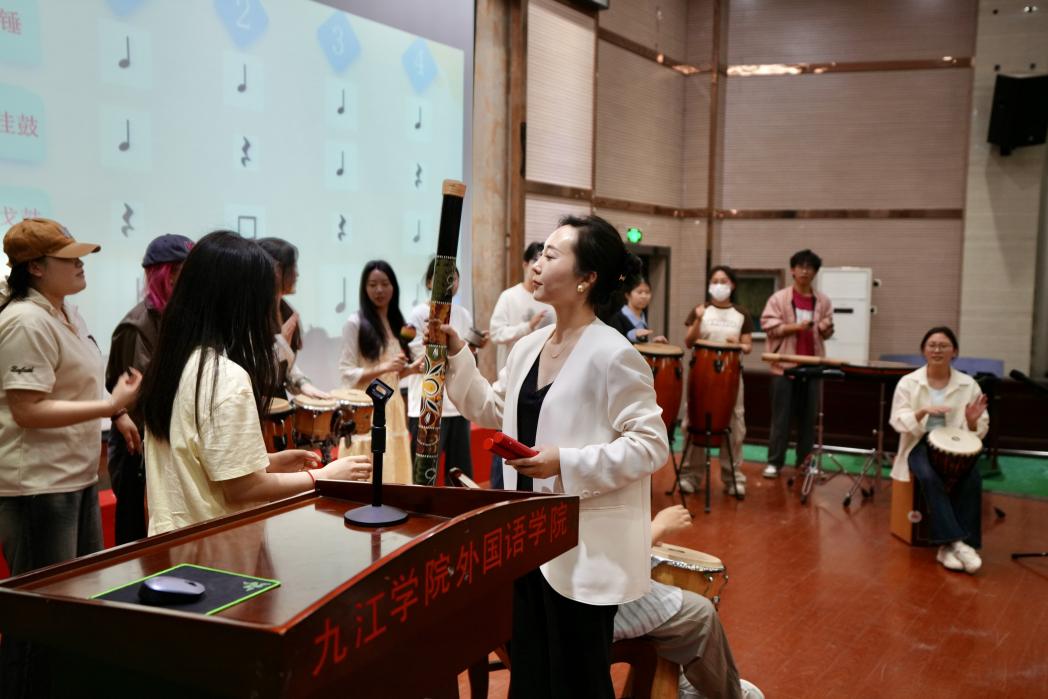 纪宇媛博士通过非洲鼓、邦戈鼓、沙锤等多元打击乐器的现场演示,生动拆解了不同乐器的演奏技巧与音色特性,并邀请学生上台即兴组合演奏,在“击打-聆听-互动”中亲身体验节奏的澎湃韵律。讲座尾声,她以“节奏中的数学密码”趣味实验为桥梁,发现音符排列背后严谨而优雅的数学逻辑,实现艺术与理性的跨界共鸣。