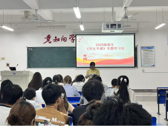 学院组织2025级新生开展“《学生手册》专题学习会”。班主任老师围绕国家法规、教学教务制度、管理规范、行为规范和奖励激励等重点内容,结合典型校园案例,解读《学生手册》中关于违纪处分、廉洁行为规范的具体条款,引导新生明确“可为”与“不可为”的界限。“以前觉得‘廉洁’离我们很远,现在知道考试不作弊、不谎报奖助材料,都是廉洁的体现。”2025 级新生王同学在讨论中分享道。