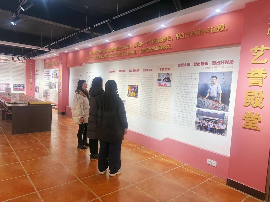 瑞昌剪纸博物馆是九江市首家非遗专题博物馆。馆内20余幅红色主题剪纸作品,以光影镂空的技艺诠释了红船精神、长征记忆等红色内核。团队与剪纸博物馆工作人员就剪纸艺术的当代传播进行深入交流,探寻红色文化与非遗融合路径。