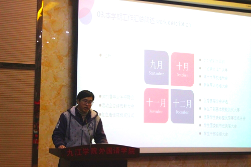 主席团成员胡飞宇首先对本部门职责进行陈述,依次展示学院各项活动开展情况,简述本学期工作汇总以及获得的主要成绩,指出在工作中出现的问题,并提出相应的解决办法。同时胡飞宇还表明,会继续加强与学生会各部门以及领导老师的联系,发挥主席团桥梁和纽带的作用,为2021年的工作计划做好统筹安排。随后,其余各部门代表按序上台致以述职报告。每个主讲人都通过精彩的PPT展示,围绕本部门该学期的工作成效、主要事务等进行阐述,并大致表述明年上半年的工作计划和未来的发展安排。